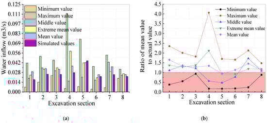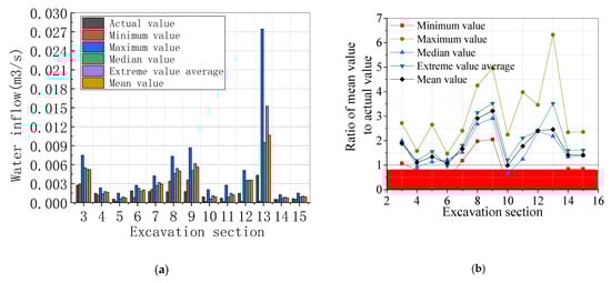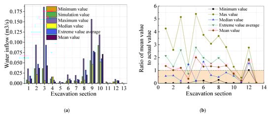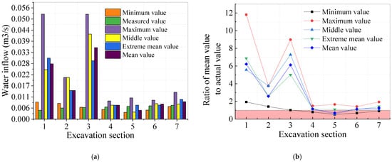 We can conclude that the excavation Sections 1 and 3–7 at the theoretical value of the water surge and the measured value is closer from Figure 17. Theoretical values and measured values have a large error at the excavation Sections 1 and 3, which is because engineering needs to supplement the slurry uninterrupted to make sure the safe of excavation when meeting great water inflow. Minimum and Median values do not have sufficient safety reserves, and the economic cost of the maximum value is too high. We find that using the average value of water inflow is closer to the actual, and make sure a certain amount of safety reserves.