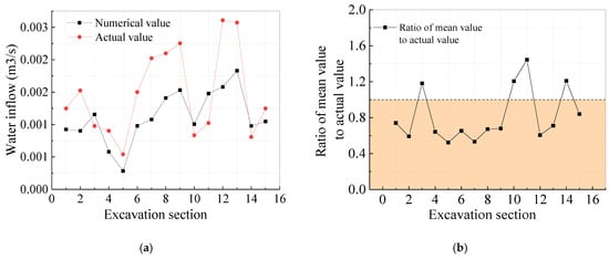 According to the Chinese standard, Goligong Mountains considers that water operation with water is allowed when the water volume in the water exploration hole is less than 0.0028 m3/s. The permeability coefficients for each hole calculated using Equation (32) are shown in Table 25. The excavation is reserved for a slurry thickness of 10 m, and the calculated influx is compared with the actual excavation in Table 26. The actual and predicted water inflow are relatively close and are less than the drainage capacity of the project.