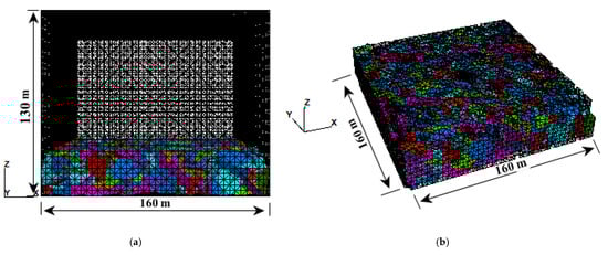 We use numerical methods to predict the actual of excavation water inflow without slurry. Take the model size of 160 m × 160 m × 130 m, and for the length of the probe hole range to take the equivalent permeability coefficient. Meanwhile, as for the probe hollow range, we use five groups of permeability coefficient values for random discrete as shown in Figure 18b. The data obtained from the overtopping of the water probe holes are shown in Table 23. The use of Equation (32) to calculate the value of the water inflow and simulation values compared in Figure 19.