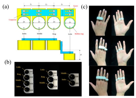 To achieve the constraint condition of ab/d joints, a joint restrictor was developed, as shown in Figure 2a. It consisted of up to 4 finger rings with a thickness of 0.5 mm connected by connecting strips. There were evenly distributed small holes on the strips to adjust the distance between the rings. The size of each part of the restrictor is customized by the hand size of each subject. L1, L2, and L3 are the distances between adjacent fingers. D1, D2, D3, and D4 are the diameters of the index finger, middle finger, ring finger, and little finger, respectively. The rings of the index finger, middle finger, and ring finger are aligned in the vertical direction while the ring of the little finger is lower than them. It is an anatomical design, and the distance between the ring of the little finger and other rings in the vertical direction is H. The restrictor worn by each subject was customized according to the measurement of their hands. The hand size of each subject is shown in Table 1.