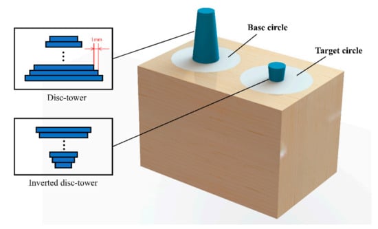 A series of hand function tests were proposed for specific purposes [,]. However, most of them are designed for functional rehabilitation training and testing of the disabled. In this study, we designed a platform to test the hand grasping ability, as shown in Figure 3, which is named the disk-tower test (DTT). There are two circles on the platform, the base circle and the target circle. At the beginning of the test, 46 polylactic acid (PLA) disks were placed on the base circle, all with a thickness of 10 mm. The maximum diameter of the disk at the bottom is 190 mm, and the diameter of the disk decreases by 2 mm from the bottom to the top, shaped like a tower. The top disk is 100 mm in diameter. The subjects needed to grasp the disks on the base circle from top to bottom in turn and put them on the target circle one by one. Then the diameter of the disk at the bottom of the target circle is the smallest, and the diameter of the disk at the top is the largest, shaped like an inverted tower. When the subjects could not grasp the disk or the disk tower on the target circle collapsed, the trial was over. Then, the diameter of the last successfully placed disk was recorded. During the test, subjects needed to grasp every disk with a precision disk gesture, and the palm was horizontal; namely, a pinch grasp was not allowed. The hand was not allowed to touch any disk except when grasping during the test.