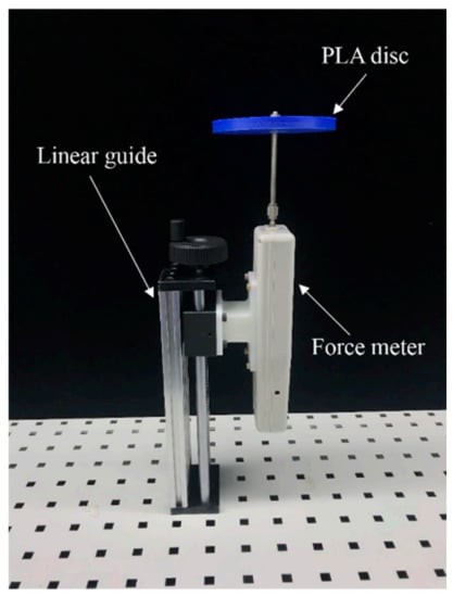 The effect of ab/d DOFs on the grasp force was tested experimentally. The setup is shown in Figure 4. A disc was fixed on the top of the digital force meter. A linear guide was used to adjust the height of the disk to enable the arm of the subject to be parallel to the ground so that they could grasp the disk only by arm strength. For each trial, the subject was asked to grasp the disc with a precision disk gesture and try their best to lift the disc. The maximum force in the process was recorded as the grasp force. A set of disks increasing in diameter with a gap of 10 mm was employed according to the DTT results in this experiment. The diameter of the smallest disk was 100 mm, and the diameter of the largest disk was smaller than the minimum grasp size in the DTT for each subject. Under four constraint conditions (Free, IM-L, MRL-L, and IMRL-L), the subjects needed to try each disk three times separately, and the results were averaged as the grasp force. For six subjects, a total of 504 trials were obtained in this experiment.