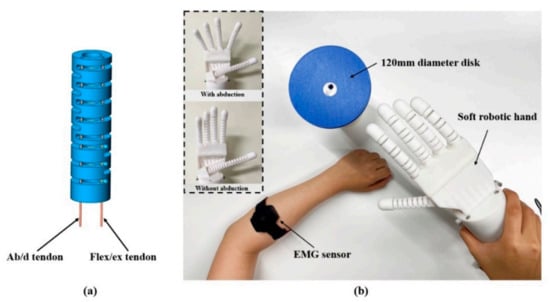 In this experiment, subjects were asked to grasp a disk with a diameter of 120 mm using the soft robotic hand. Two pregrasp gestures were defined: one was hand open without finger abduction, and the other was hand open with the four fingers abducting (Figure 5b). The subject needed to first adjust the soft hand to an adequate position and gesture and then control the soft hand to execute the programmed grasp through the surface electromyography (sEMG) sensor attached to their arm. A simple threshold controlling method was used to trigger the grasp motion. After this, the subject needed to lift the disk to a certain height and sway the soft hand. If the disk did not fall or slide, the grasp was successful; otherwise, it failed. Each subject performed ten attempts using two pregrasp gestures, and the success rate was recorded.