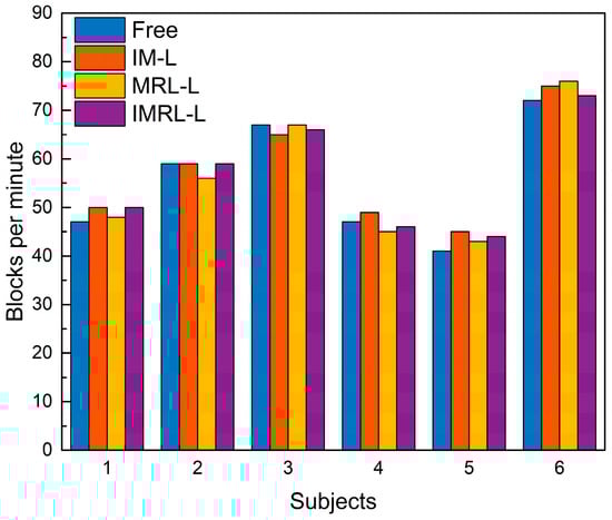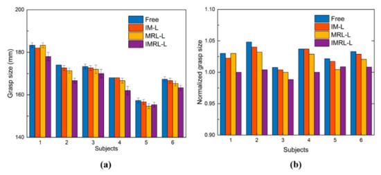 The experimental results of DTT are shown in Figure 6a, which shows that all subjects had the smallest grasp size under the IMRL-L condition and the largest grasp size under free conditions, with an increase of 4.67 ± 1.93 mm. The most significant gap is 7.33 mm (S2). Defining the grasp size under the free condition as the baseline, the average difference between it and the grasp size under the IM-L, MRL-L, IMRL-L conditions are 0.78 mm, 1.67 mm, and 4.67 mm, respectively. It should be noted that there were two identical cases: the grasp sizes of S1 under the Free and MRL-L conditions were both 183.33 mm; and the grasp sizes of S4 under the Free and IM-L conditions were both 168 mm. This can be explained by the fact that when grasping a disk, at least three fingers are usually used to contact to gain a balanced state. Therefore, there is still at least one finger (except the thumb and the middle finger) to abduct to form a larger grasp workspace under IM-L and MRL-L conditions. Figure 6b shows the normalized grasp size, which was evaluated using the Wilcoxon test, and the results are shown in Table 2. There was a significant difference between the free condition and the IMRL-L condition.