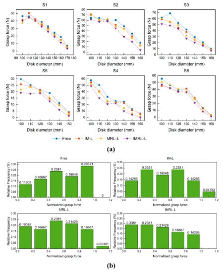 The experimental results of the grasp force under four conditions are shown in Figure 7. Figure 7a shows that the grasp force of all subjects basically decreases with increasing the disk diameter. For all disks, the average grasp force under the free condition is largest, while that under the IMRL-L condition is smallest, with a gap of 5.27 ± 4.25 N. The differences between the free condition, the IM-L condition and the MRL-L condition are comparatively small, which are 3.10 N and 3.95 N, respectively. It should be noted that for S1, the grasp forces of the disk with a diameter of 110 mm are larger than those of the disk with a diameter of 100, which might result from when the disk is relatively small, the variation of the disk diameter is not significant for the grasp force. We can see that as the diameter increases further, the decreasing trend of the grasp force is more prominent. Figure 7b shows the frequency distribution histogram of the normalized grasp force under four conditions. The frequency distribution in the range of 0.8 to 1 is the highest under the free condition. As the number of restricted ab/d DOFs increases, the frequency distribution inclines to a lower range. The Wilcoxon test was performed on the normalized grasp force, and the results are shown in Table 2. There was a significant difference between the free condition and the IMRL-L condition.