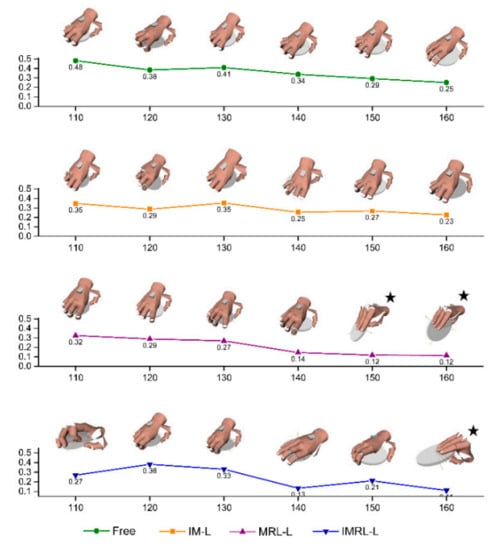 The results of the simulated grasp are shown in Figure 8 and Figure 9. In Figure 8, we show the maximum grasp quality out of 10 planning grasps of each constrained condition and disk diameter. The maximum evaluation of grasping under the free condition is significantly higher than that under the IM-L, MRL-L, and IMRL-L conditions except when the disc diameter is 120 mm. The particular case at 120 mm can be explained by the simulated annealing algorithm combining much randomness, leading to a probability event. In addition, it should be noted that except for the three grasping postures with an asterisk, the planned grasping postures all belong to the precision disk defined by Feix. For the hand whose ab/d DOF is restricted, the simulator had difficulty finding a way to grasp the disk with this posture as the diameter increased and was then forced to switch to the extension defined by Feix []. Such cases imply that ab/d DOFs could enable a superior grasp gesture to achieve a larger grasp workspace.