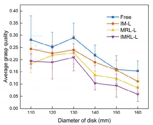 Each point in Figure 9 represents the average grasp quality of 10 superior grasping postures under four different conditions. The error bar is the standard deviation. We can see that the grasp quality under the free condition is significantly higher than that under the other three conditions, and the grasp quality under the IMRL-L condition is the lowest. Setting the average grasp quality under IMRL-L as a benchmark, the grasp quality under the previous three conditions increased by 76.7%, 50.1%, and 25.1%, on average. It is worth noting that when the disk diameter exceeds 130 mm, the grasp qualities under all four conditions exhibit sharp decreasing trends, indicating an increasing grasp difficulty as the object size increases.