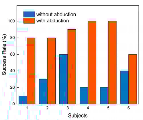 Comparison of grasping success rate with and without abduction of a soft robotic hand.