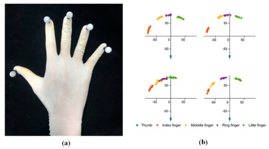 One of the crucial reasons that ab/d DOF promotes grasp size, force, quality and success rate is probably the more extensive active range of motion (ROM) of the fingers [], enabling a larger grasp space and more dexterous contact points between fingers and objects. To further verify this, we studied the contact point under four conditions when grasping a disk with a diameter of 120 mm, whose size is close to a CD. A glove with markers attached to the fingertips was used (Figure 11a). The contact points during a tenfold grasp process were recorded, as shown in Figure 11b. We can see that the points under the free condition were most dispersive, possibly implying more stability during grasping, and the points under the IMRL-L condition were most centralized.
