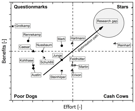 In summary, it should be noted that there are already many different methods in the literature. In the following, the methods will be evaluated in terms of effort and benefit. This evaluation will be assessed in the context of a portfolio analysis and classification into four fields: Questionmarks (a high benefit is offset by a high effort so that in each individual case the usefulness must be examined), Poor Dogs (these methods have a high effort and a low benefit so that they do not appear suitable), Cash Cows (these methods have a low to medium benefit at likewise low to medium effort so that an application is advantageous) and Stars (these methods offer a high benefit at low effort and are, therefore, the best). It is noticeable that none of the methods are currently optimal with regard to their individual implementation effort, adaptation and implementation and their benefit for the company (compare Figure 1). Accordingly, an optimization can be made towards a lower effort. According to portfolio analysis, these methods can become cash cows. Overall, it is shown that methods that are both low cost and highly useful currently exist only in approaches with the methods according to Hartmann and Reinhart.