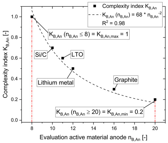 With the help of this description, it is possible to determine the complexity values K on the basis of the evaluation score n of any other new materials. For the materials considered, the specific complexity values of approximately 0.7 for silicon, approximately 0.6 for LTO, approximately 0.5 for lithium metal and approximately 0.3 for graphite result. Furthermore, if the evaluation of the considered materials is updated, a simple adjustment of the specific complexity index is possible.