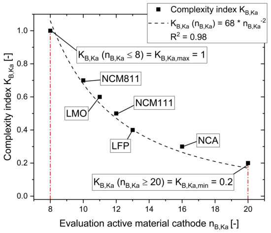 As with the specific complexity of the anode active materials, this equation can also be used to determine complexity values K based on the evaluation score n of any additional or new materials. Thus, the specific complexity values of about 0.7 for NCM811, about 0.6 for LMO, about 0.5 for NCM111, about 0.4 for LFP and about 0.3 for graphite are obtained. Furthermore, when updating the evaluation of the considered materials, a simple adjustment of the specific complexity index is possible.