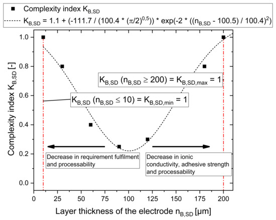 For the sake of simplicity, porosity is, therefore, summarised in the following with the parameter layer thickness as a complexity characteristic, e.g., the layer thickness of the electrode determines the energy density and, thus, the degree of requirement fulfillment at electrode, cell, module and system levels. In particular, layer thickness is an essential parameter for the complexity of production and handling of the coated film at the electrode level. Monolayers, which consist of one to two times the particle size diameter (x50), are particularly complex in this respect. Since agglomeration must be strictly avoided to produce monolayers, the slurry production process (mixing and dispersing) and coating process are more complex. Very thick layers, in turn, have various disadvantages that result in increased complexity. These include a reduction in adhesive strength, inhomogeneous material distribution, increased production effort and longer production times as well as limitations in effective ionic conductivity (from a layer thickness of approximately 154 µm [28]). (Refs. [27,29,30,31]) Thus, the specific complexities shown in Figure 6 result for the different layer thicknesses.