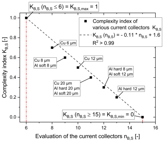 This results in average specific complexity values at a thickness of 8–12 µm. There is a tendency for hard aluminium current collectors to be less complex and thin foils to show the greatest complexity. When updating the evaluation of the considered current collectors, a simple adjustment of the specific complexity index is possible.