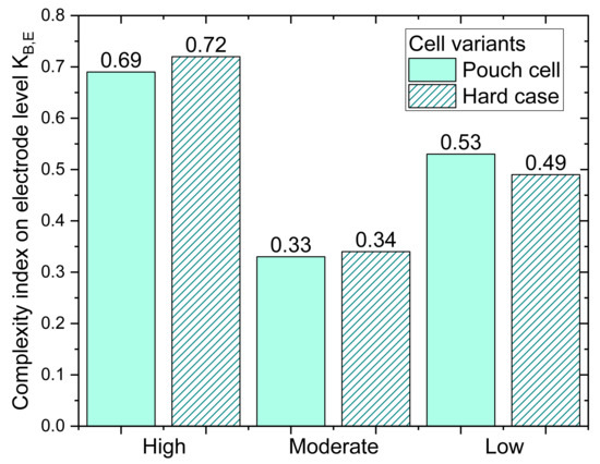 The developed method for complexity evaluation is an enabler for comparing different electrode variants. As an example (see Figure 8), six different electrode configurations were compared: three for pouch cells and three for hardcase cells. The electrodes were configured differently with regard to their energy density. First of all, it is evident that pouch and hardcase cells have very similar complexities with regard to the different final energy density configurations. It is also clear that high energy densities at the electrode level indicate the highest complexity, and moderate ones indicate the lowest. However, very low energy densities also indicate a higher complexity than moderate energy densities. Here, a linear progression could have been assumed. However, the targeted consideration of complexity shows that moderate energy densities can be advantageous.