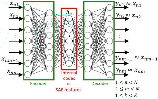 Instead of purely minimizing the cost function , which calculates the difference between and , a sparse penalty may be added in the function during the training phase of the network. Function is selected to increase the capacity of the AE to represent with a small number of components. In this case, the AE is called a Sparse Auto-Encoder (SAE). Goodfellow et al. (2016) [] presented an excellent overview of AE and SAE, which is recommended for further inquiries.