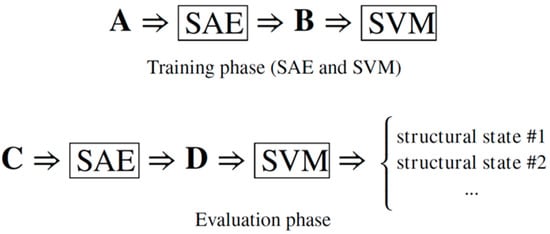- Evaluation phase. Assuming that the SVM models are well-trained and achieve acceptable classification rates, the performance of the proposed SHM strategy is directly linked to the SAE’s capability to extract features from the dynamic signals adequately. The current step is developed by evaluating the set of dynamic measurements that were not used in the previous phase, gathered in matrices and . Matrix , containing vectors (being , where is the number of available dynamic signals), is presented to the trained SAE network, resulting in a matrix with the respective vectors . Finally, matrix is presented to the trained SVM, whose output is the structural condition.