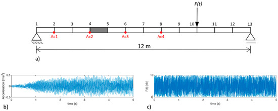 In order to initially evaluate the SAE’s efficiency to characterize vibration data, numerical simulations are performed using a simply supported beam model (see Figure 4a). The beam is modeled with twelve Euler-Bernoulli elements (two degrees of freedom per node - one translation and one rotation) with the following properties: total length = ; Young’s modulus = Pa; cross-section area = ; specific mass = and moment of inertia = . The numerical integration is performed by using Newmark’s method with a time step of 0.001 s. The excitation force is a typical random vector with 10 kN of maximum magnitude, which is randomly set for every dynamic simulation carried out and is applied at node 10. (kN) is simulated as shown in Equation (1):