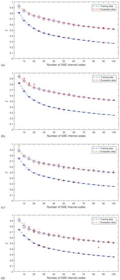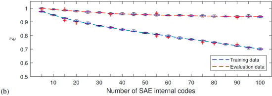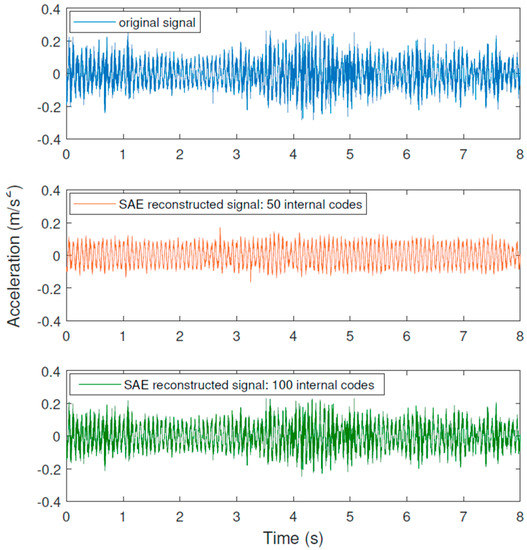 Since the damage identification of the proposed strategy is based on the features extracted by the SAE, the first stage of the analysis examines how many SAE internal codes are necessary for a good representation of the dynamic structural responses. As previously mentioned, the SAE training is performed by reconstructing its input data. Therefore, it is reasonable that the difference between the original and the reconstructed signals may indicate whether the extracted characteristics contain relevant information about the structural response or not. In the present paper, this difference is denoted as reconstruction error , and is individually calculated by Equation (2):