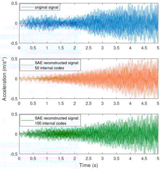 In Figure 5, it is possible to observe that the plotted curves are quite similar for all simulated accelerometer channels. In all cases, the median of training and evaluation errors tends to have a linear behavior as the number of internal codes increases. For 100 SAE characteristics (internal codes), achieves values around 0.25 and 0.50 for training and evaluation data, respectively. Moreover, although not represented in the graphs the same linear behavior was verified for SAE models, with more than 100 internal codes (from 100 to 500). Obviously, the greater the number of SAE features, the better the signal reconstruction and the smaller the errors . However, the focus of this work is not to exactly reconstruct the signal, but to extract key elements capable of characterizing the differences between “normal” and “abnormal” structural responses. Figure 6 displays an example of the SAE reconstructed response when using 50 and 100 internal codes in comparison with their respective original signals. Both plots reveal that just a reduced number of SAE features are enough to fairly represent the original simulated accelerations. For this reason, the authors opted to classify the data with 50 and 100 SAE characteristics (the start and the end of the linear behavior region exhibited in the graph). It can also be noted that the reconstruction errors of the training data are smaller than those obtained for the evaluation data, regardless of the number of SAE characteristics. This is an expected result, given that the first group of data was used to create the SAE models, and the second one has never been presented to them.