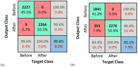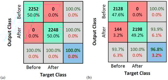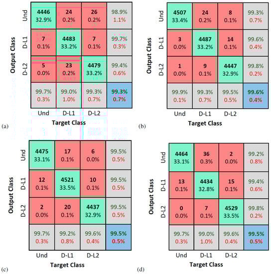 The performance of the proposed approach for 30 different SAE/SVM models developed with 50 and 100 internal codes, respectively, is presented in Table 3. The classification rate is the mean value of correct identifications achieved in each model (average of the 30 models), only considering the evaluation data. Figure 7 and Figure 8 show the confusion matrices related to the classification rates obtained in Table 3. These matrices point out the classification frequencies of the evaluation examples along with the three structural conditions. The diagonal elements in green are the amount and percentage of correct classifications, whereas the red elements refer to the amount and percentage of misclassified data. The rightmost column of the matrix exposes the precision metric (true positives/(true positives + false positives), and the row at the bottom exposes the recall metric (true positives/(true positives + false negatives). The element in the bottom right of the plot represents the overall accuracy. The “Output Class” corresponds to the predicted damage level and the “Target Class” to the level which the signal really belongs. They were constructed with all evaluating subsets, resulting in 13,500 different analyzed examples (450 evaluating examples 30 models).