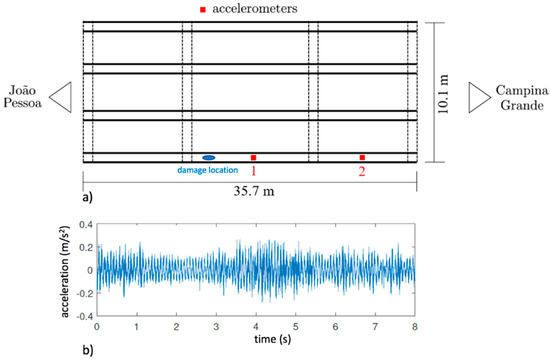 Várzea Nova viaduct. (a) Top view and experimental setup. (b) Typical response for accelerometer 1.