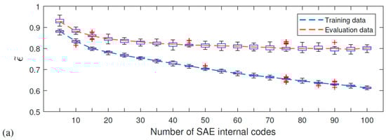 Figure 5 shows a box plot evolution of the error as the amount of SAE features increases for all selected points of the numerical beam example. Each box was created by considering 30 different SAE models that reduce the problem’s dimensionality from 5001-time samples to the indicated number of internal codes (vector ). The thirty different SAE models are auto-encoder models developed with the same parameters but varying in the random seed. The boxes associated with the blue dashed line indicate the reconstruction performance of the 30 models for data used during the training phase. The boxes related to the red dashed line, on the other hand, correspond to the reconstruction errors of the same models when applying unseen data (evaluation phase).