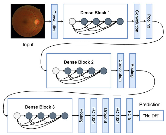 The proposed model is based on the DenseNet121 architecture [11] that receives an RGB image of 224 × 224 pixels. The weights were previously trained with the ImageNet dataset and used to obtain sufficient features to optimize the weights of the fully connected layer as output. The convolutional layers are also known as the feature extraction stage and the last layer as the classification stage. The model output presents a softmax activation to designate probabilities to each class. A special feature of DenseNet, is that each output of a convolutional layer is concatenated to the subsequent layers of the same block as shown in Figure 1.