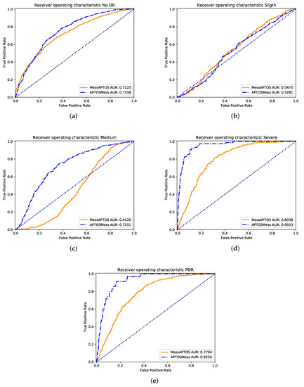 In terms of testing results, the obtained metrics show that the model reaches a better precision trained over Messidor. Nevertheless, a better recall and F1-score is obtained for the model trained over APTOS. From the Figure 2 with the ROC curves, it can be appreciated that the model trained over APTOS learned more useful features for most of the classes than the trained over the Messidor dataset. The most difficult class was the Slight NPDR because the area under the ROC curve was almost the same for both datasets.