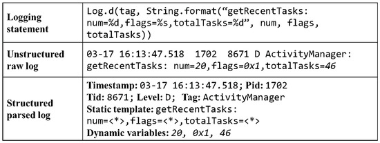 Most data mining models used in log analysis require structured input. Therefore raw logs cannot be used as input directly [12,13,14]. To conquer the unstructured nature of raw logs, we need log parsing to convert the unstructured logs into a structured format before analysis [15]. The goal of log parsing is to extract the static template, dynamic variables, and the header information (timestamp, log level, logger name) from the raw log message to a structured format. Such structured data can be fed into downstream log analysis models.