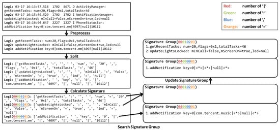 Specifically, we put all punctuations used to calculate the signature in a table called the punctuation table. For each character in the split token list, we count it in a frequency table if it appears in the punctuation table. For the convenience of the subsequent calculation, we convert the frequency table into a number like a radix conversion. For each punctuation and its frequency, we multiply by the radix and add the current frequency. For example, in Figure 2, there is zero vertical bar (“|”), one colon (“:”), two semicolons (“,”), and three equal signs (“=”) in the log message log1. So, the signature calculated is 00010203 if we take ten as the radix. In the implementation, we take 100 as the radix, assuming that the frequency of any punctuation will not exceed 100. We can quickly locate the signature group according to the number in the subsequent step by converting. This number is returned as the signature. Algorithm 1 shows the detail of how to calculate the log signature.