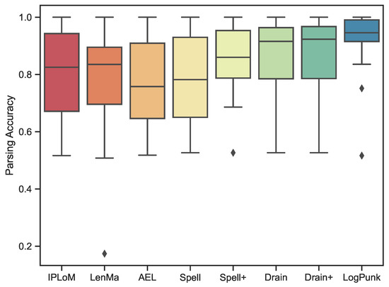 For comparison, the log parser is arranged in ascending order of the average precision from left to right. We can observe that LogPunk has the highest average accuracy and the minimum variance, which means robustness. We also observed that Spell+ is more robust than Spell, and Drain+ and Drain have little difference in robustness. Because Drain has some strong assumptions, the preceding tokens of the same log type are the same. Such assumptions are the main reason for Drain’s error in accuracy.