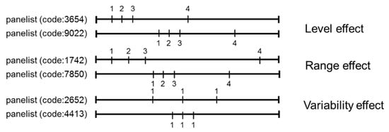 The level effect shows the location of the average points on the intensity scale, the range effect is the exact variance and the variability effect is characterized by the extent of the values. The reasons for the different use of the scale are worth exploring because this allows the panel leader to define individualized tests, thus improving the reliability of the assessor and the entire panel. Correcting differences in scale use reduces the interaction effect [13,14]. During sensory evaluations, differences in the range, standard deviation and mean of the points are due to the different use of the scale (level, range, variability). In general, scale effects are usually solved in practice by product-specific training of the assessors. In particular, the scale anchoring method is used with reference samples and/or reference materials, to calibrate the panel with appropriate reference standards. It is appropriate to use an unstructured scale with values fixed at both ends [47,48].