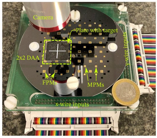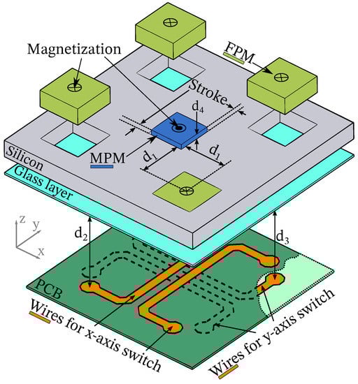 Two pairs of wires under the cavity are used to actuate the MPM along the x and y axes. The principle of actuation of the EDA is the Lorentz’s force generated by the current carried by these wires and the magnetic field of the MPM. The current used to displace the MPM is called “driving current” (Id). We called the wires by its actuating axis, i.e., the x wires are the ones actuating the MPM in the x-axis as shown Figure 1. Each pair of wires is printed in different planes of a multi-layer PCB circuit, in order to avoid electrical contact between them. Both actuating wires can operate simultaneously. If both pairs of wires are activated, the MPM will move in a diagonal direction, and both currents are considered as driving currents . If one current is used to displace the MPM and the other generates a force towards the cavity wall, this last current is called “holding current”. The holding current could be used to reduce the straightness error of the MPM’s displacement along the moving axis, as it forces the MPM to stay in contact with the straight silicon wall. Finally, a thin glass layer is placed between the MPM and the PCB to avoid their direct contact and give the MPM a plane surface to slide between the discrete positions.