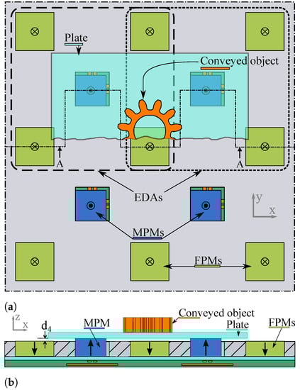 Different physical principles have been used to obtain planar motion micro-conveyors such as: electrostatic [6], electromagnetic [7,8], piezoelectric [9] and pneumatic [10,11,12]. Air jet pneumatic conveyors generate fast and contactless movements: in [10], the authors obtained speeds of 300 mms−1 with precision of 93 . Soft actuated pneumatic conveyors generate medium forces with contact movements: in [12] the authors obtained 70 mms−1 movements with 16 degrees of freedom (DoF). On the other hand, all pneumatic conveyors require constant energy input to hold a position, high pressures, complex fluid models and control. They are also difficult to integrate due to their pipework. Piezoelectric conveyors achieve long-range motions with sub-micrometer accuracy: the system presented in [9] had a range of 10 with a resolution of 2 and speed of mms−1. On the other hand, they need high working voltages at high frequencies, are sensible to temperature and present strong nonlinearities, requiring complex control. Electromagnetic systems present large strokes with medium forces, slower response times than piezoelectric or electrostatic actuators but faster than electrothermal actuators, are relatively easy to build and assemble, and could generate levitation and driving forces. In [8], a Maglev conveyor achieved speeds of mms−1 with resolutions of 100 . Nevertheless, they do not scale as well as the other systems beyond the millimeter size.