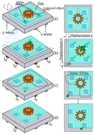 The micro conveyor is formed with an array of EDAs: a Digital Actuator Array (DAA). Adjacent EDAs share a pair of FPMs to decrease the DAA size (Figure 2). The conveyed object is placed on a glass tray that contacts the top side of the MPMs. The DAA combines individual actions of each EDA to obtain a cumulative displacement of the conveyed object based on a “stick-slip” principle. The strategy to convey an object on top of the DAA using this collaborative actuation is presented in Figure 3. The conveyed object is placed on top of the MPMs (a). The object is considered to be non-ferromagnetic to avoid magnetic interactions with the actuators. The EDAs are simultaneously switched to displace the object (b). During this step, the friction force between the MPMs and the conveyed object accelerates the object until the MPMs reach their discrete position (stick phase). Once the MPMs stop, the dynamic friction due to the relative movement between the moving object and the static MPMs acts as a brake to the object until it stops, reaching a “displacement step”. The second phase “slip” resets the configuration for a new displacement step: each MPM is individually switched back to return to its initial position ((c) to (d)). The friction force between a single MPM and the object is lower than the opposition force of the other MPMs. During steps (c) and (d), the MPM slides relatively to the object which, in theory, does not generate motion. In practice, a small “return displacement” was observed due to non-uniform distribution of the object weight on the MPM and friction inhomogeneity. This influence will be studied in the experimental section. When all the MPMs are back to the initial position, a new step of displacement of the object can be done (a). The current used to return the MPMs to the initial position is noted as return current (Ir) in Figure 3. The DAA can be extended in a modular way by adding EDAs to the array .