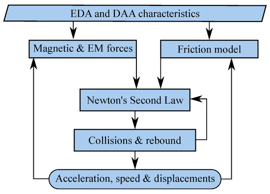 Figure 5 represents the flowchart of the developed dynamic model. Based on the EDA and DAA characteristics, the magnetic, electromagnetic and friction forces are computed for a given time step. Then, Newton’s second law is used to determine the MPM and conveyed object accelerations. The obtained accelerations are then integrated to obtain the speeds and displacements of the MPM and of the conveyed object considering the collision and rebound effects. Then, the calculation for the next time step can be done.