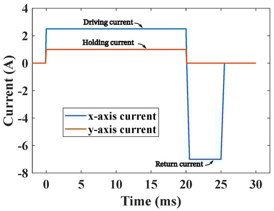 The model predicted the experimental tendency correctly. The root-mean-square error (RMSE) between the experimental and simulated results without holding current was for the x-axis and 19 for the y-axis. The RMSE between the model prediction and experimental results with 1 holding current were ) for the x-axis and for the y-axis. In order to implement our optimum control strategy, the minimum current values ensuring a motion were experimentally sought and found to be (corresponding displacement: 179 ) and (205 ) for x and y-axes without holding current, respectively. When using a 1 holding current, the minimum driving currents to ensure a motion were higher and found to be (189 ) and (177 ) for x and y-axes, respectively.
