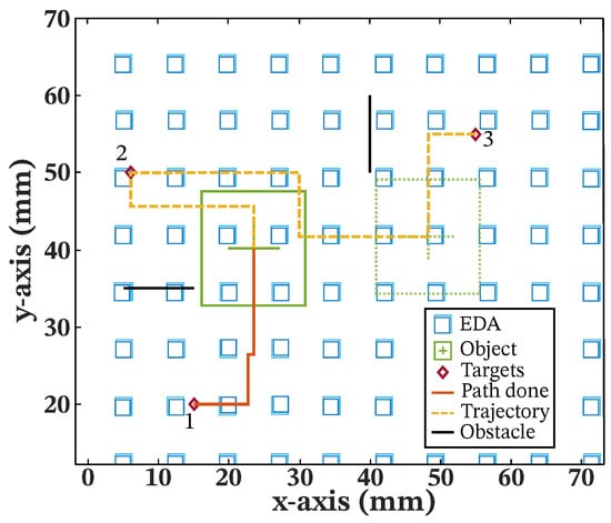 Our previous work demonstrated that an optimum control strategy in terms of energy and final position error was to use the maximum axial displacement at each step to approach the target point and then use a correction step at the end of the trajectory to attain the final position [28]. The A* algorithm uses this control strategy, generating a grid that allows displacements only in the axial directions. Each node of the grid is at the maximum displacement step distance from each other. The target points are approximated to the nearest node and, once the object arrives there, the difference to the real target is then injected into the inverse model to find the correction step. As the A* algorithm minimizes the distance to the obstacles in its search for the optimum trajectory, we included an additional parameter, called safety margin, to force the path to respect a distance to the obstacles. This margin is set to 1 in the example of Figure 8.