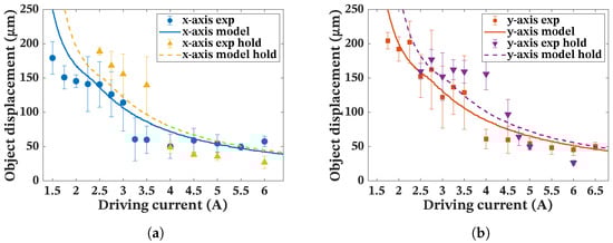 From Figure 9, the object displacement decreased as the driving current increased on both axes and for both conditions (with and without the 1 holding current). When the injected current increases, the MPM displacement time and the energy transfer through friction to the object are reduced, which leads to a decrease of the object displacement. For the same driving current value, the obtained displacement is lower along the x-axis than along the y-axis. This is due to the lower distance between the wires actuating the MPM along the x-axis than for the y-axis ( and in Table 1). Therefore, the electromagnetic force is higher for the x-axis, inducing a shorter MPM displacement time and consequently a lower energy transfer to the object, as explained before. For example, with a 2 driving current (without holding current), the object displacement along x and y-axis are 151 and , respectively. The holding and no holding results followed a similar tendency. The holding current induced a shift towards higher driving currents (shift of the initial curve to the right). This is due to the higher driving current intensity needed to overcome the increased friction force generated by the holding current. The error bars decreased as the driving current increased for both conditions. This is attributed to the important influence of the friction conditions at lower currents and its reduced influence with faster kinematics as the current increases.