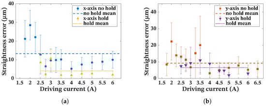 From Figure 10, the straightness error decreased as the driving current increased for both axes and for both conditions (with and without holding current).