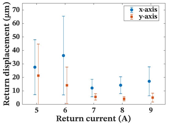 Different return current intensities along the x and y axes of a 2 × 2 DAA were injected following the return process. The DAA carried a object. Each return current intensity was executed 20 times to obtain a mean and standard deviation values. Figure 12 presents the return step displacement vs. return current intensity. From Figure 12, different behaviors were observed for the x-axis and y-axis.