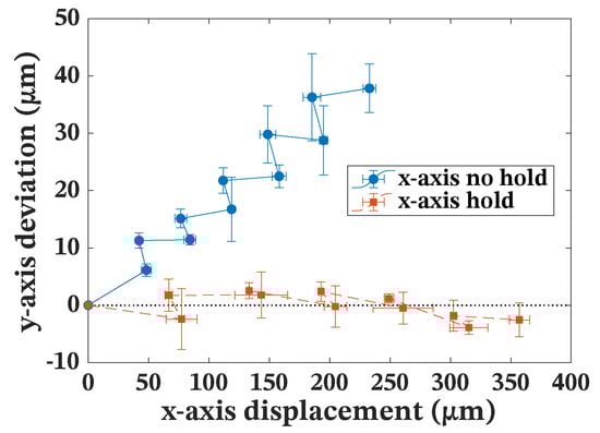 Next, we explored the holding current influence on multiple displacement steps for straight trajectory generation. This was important as the trajectory algorithm was designed to execute uni-dimensional (axial) displacement steps and we are in an open loop control scheme. We executed 6 consecutive displacement steps in the +x-axis with and without a 1 holding current and measured the deviation along the y-axis. This axial trajectory was executed 10 times to obtain a position standard deviation, represented by the error bars in Figure 13, that shows the results.