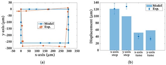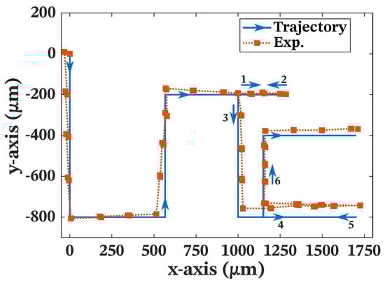 The rectangular trajectory is divided on its component displacement steps: eight normal displacement step (four along the x-axis plus four along the y-axis) and four tuning or adjusting steps (two along the x-axis plus two along the y-axis). The tuning steps come from the trajectory control algorithm with A*: it executes the largest possible step in the wished direction, the maximum possible number of times and, once the object arrives near the wished position, the controller adjusts the last step to reach the position. Figure 14b compares the model-predicted displacement for each type of step with the corresponding experimental results. From Figure 14b, the x-axis displacement step was almost perfectly predicted ( exp. against model). For the y-axis step, the experimental displacement was larger than expected ( exp. against model). The root-mean-square error for the four type of steps was .