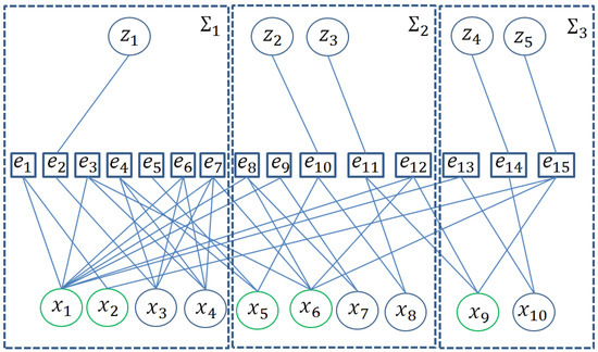 A model is used to illustrate the concepts. This is composed of fifteen equations, to , relating the unknown variables and the known variables . The representation in a bipartite graph for this system is shown in Figure 1.