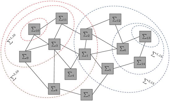 With the mathematical model defined in Section 4, it is now helpful to define the neighbors of each subsystem. For subsystem , the set of first level neighbors is defined as , the set of second-level neighbors as and the set of third level sub-systems as . For subsystem , the set of first level subsystems is defined as and the set of second level subsystems as . For subsystem , the set of first level subsystems is defined as and the set of second level subsystems as , and, finally for subsystem , the set of first level neighbors is defined as , the set of second level neighbors as and the set of third level subsystems as . As an example, Figure 6 shows how these levels are defined for subsystem .