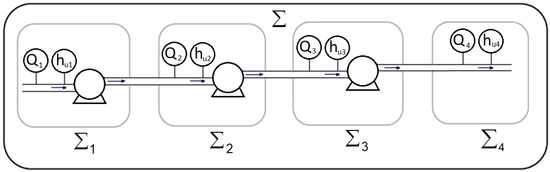 Figure 5 shows a diagram with the structure of the oil pipeline under study, identifying its corresponding sub-systems detailed ahead. and are the oil flow rate (measured with flow sensor) and the head (measured with pressure sensor) before the oil-pumping station of each i section of the OPS, respectively. Applying Definition 1, is the OPS and using Definition 3, is the i section of the OPS.