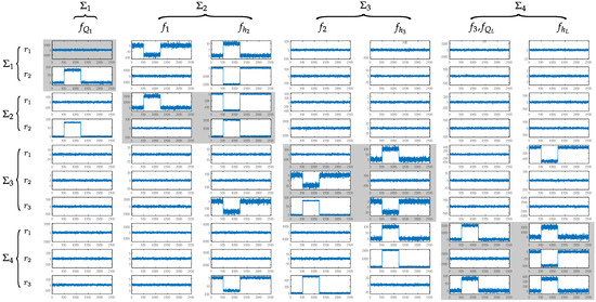 Ultimately, to validate the implementation of the designed distributed FDI system, all the faults of the set of faults of interest are emulated: faults , and related to pressure sensors, faults and related to flow sensors and faults related to pipeline segments. Then, in Figure 8, the response of the system to emulations of all the faults simultaneously is presented, and it can be seen that the system detects them for all these signals through the response of the residuals that differ from zero during the duration of the fault. In the same way, isolation is demonstrated by different fault signatures. The results shown in Figure 8 demonstrate that all faults can be detected and that a different fault signature is generated for all faults except for faults and that cannot be isolated from each other. Each column of this figure corresponds to each fault with simulation occurring, and each row corresponds to the sensibility to each residual generator for each fault with emulation occurring.