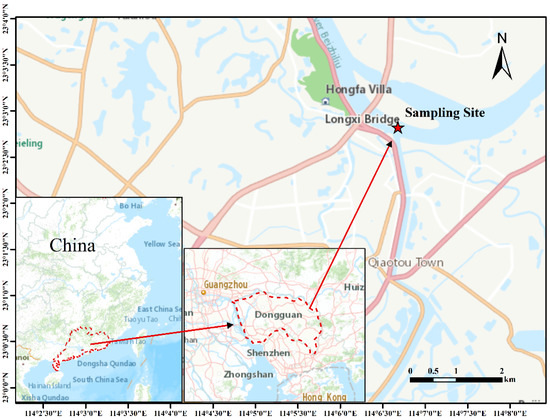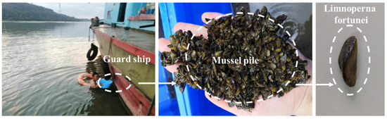 In this study, Limnoperna fortunei were taken from the wall surface of a warning ship at Taiyuan Pump Station, Qiaotou Town, Dongguan City, Guangdong Province, China (114°6′40.213″ E, 23°2′48.888″ N, Figure 1). Use a flat-head spade to sample the attached Limnoperna fortunei, remove the dead individuals, wash the silt adhered to the byssus and sample surface with clean water and wipe the surface moisture (Figure 2). Use electronic balance to weigh Limnoperna fortunei samples. Each sample was measured three times, and the average value of the measured results was recorded as the quality of the sample Limnoperna fortunei.