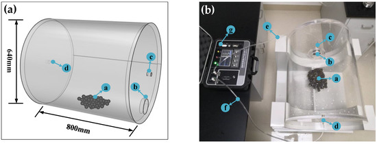 According to the water pipeline section scale 1:10 design, the test device and the site layout is shown in Figure 3. The device is made of transparent plexiglass, and the gas sampling hole (c) and the reflux hole (d) are set on both sides of the left and right walls. The gas sampling pipe (e) and gas reflux pipe (f) of the online gas detector (g, Model NF-GAS4-200F) are respectively connected, and the multi-purpose hole (b) is used for adding and cleaning Limnoperna fortunei (a) before and after the test. The resolutions of NH3, H2S, and CH4 sensors are 0.1 ppm, 0.01 ppm, and 0.1% LEL, respectively. In order to ensure that the temperature, humidity, and other environmental conditions in the device are consistent with the on-site situation, the test is carried out at 30–35 °C. Before the test, the device was filled with water, and then the water was drained to simulate the pipeline maintenance process; finally, the humidity in the device was maintained at 63%~65%RH. In the formal experiment, we put the Limnoperna fortunei into the test device and made them die of natural dehydration. The three harmful gases of NH3, H2S, and CH4, as well as environmental factors such as temperature, humidity, and oxygen content during the putrefaction of Limnoperna fortunei, were continuously monitored.